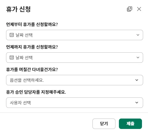 슬랙에서 워크플로를 활용하여 휴가 신청 및 승인 프로세스를 자동화할 수 있는 휴가 봇을 만들어 볼게요.