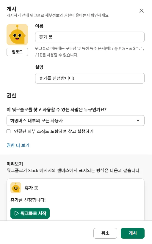게시 전 워크플로 이름과 설명을 수정할 수 있어요. 워크플로를 사용할 수 있는 사람의 범위도 설정할 수 있어요.