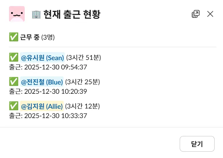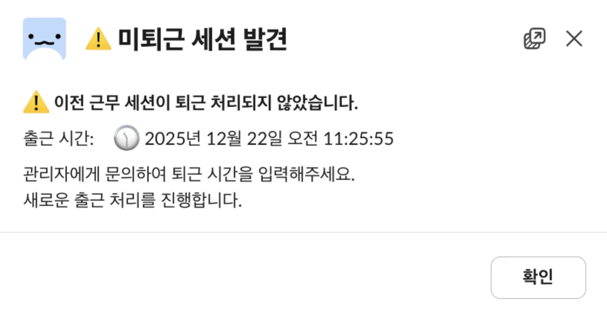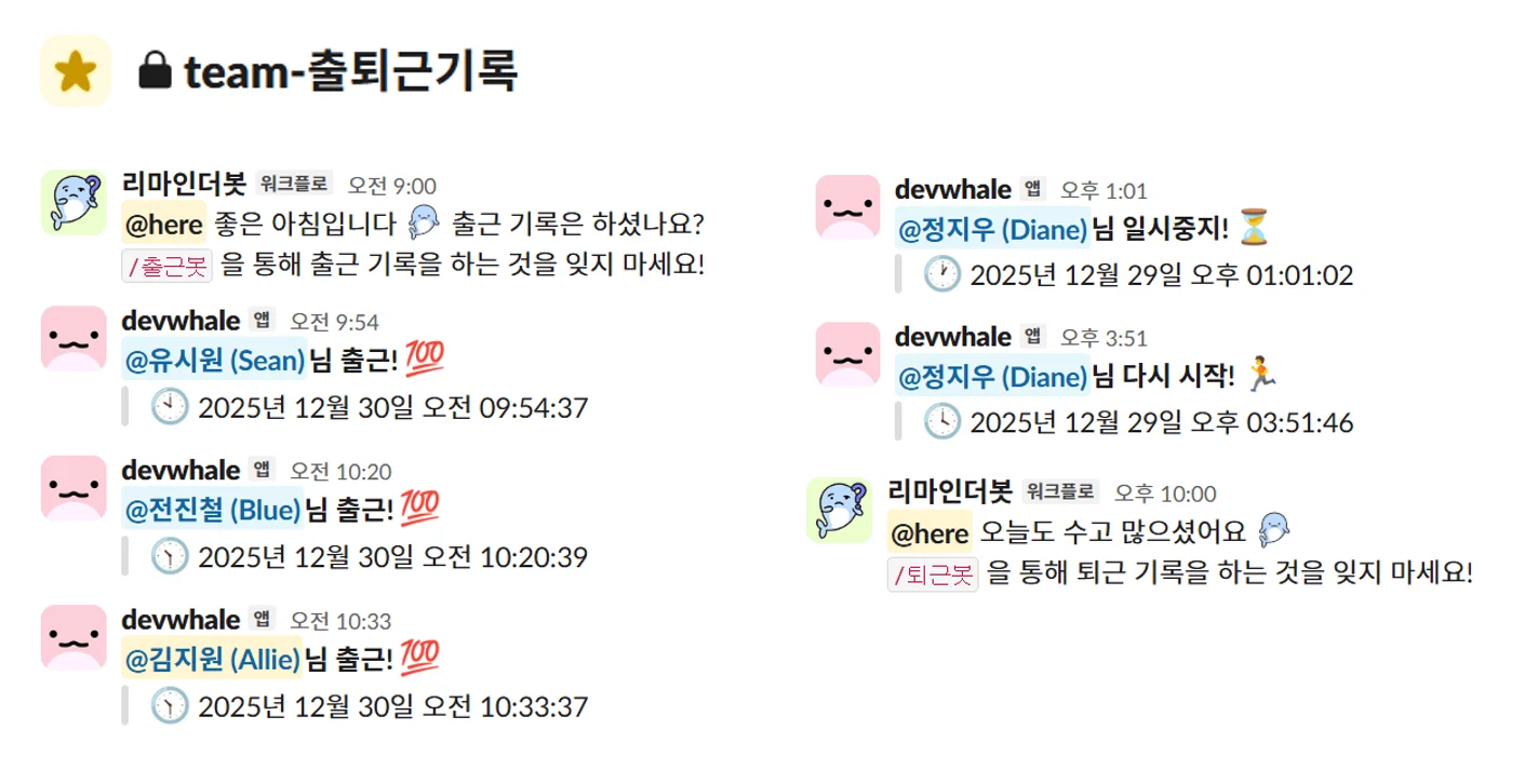 출근, 퇴근, 근무 일시정지, 근무 재개 등의 정보가 포함된 메시지를 슬랙에서 바로 전송해 구성원이 동일한 방식으로 출퇴근을 기록하도록 안내할 수 있어요. 전날 퇴근 기록이 누락된 경우에도 다음 날 출근 시 이를 안내하고, 담당자를 통해 근무 시간 처리를 이어서 진행할 수 있습니다.