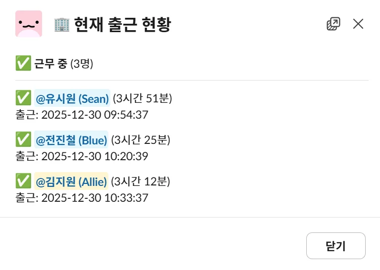 출퇴근 기록뿐 아니라 현재 근무 상태도 함께 확인할 수 있어요. 누가 근무 중인지, 이미 퇴근했는지를 실시간으로 볼 수 있어 팀 단위 업무 조율이나 협업 상황을 파악하는 데 참고할 수 있어요.