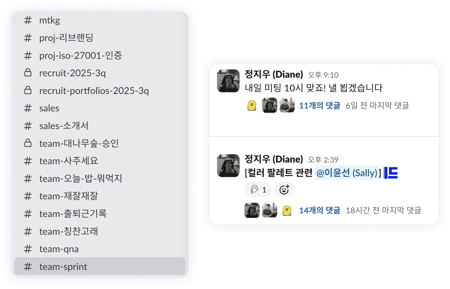 슬랙의 근간을 이루는 채널 - 메시지 - 스레드 기반의 채팅 기능을 활용해 구조화된 대화를 나눌 수 있어요.