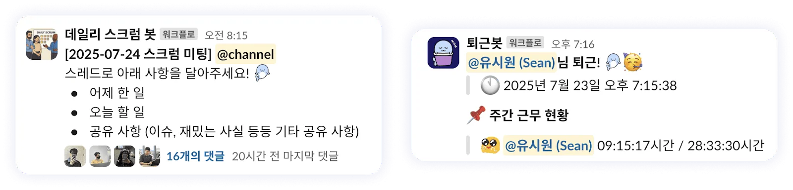 * 허밍버즈 내부에서 만들어 활용 중인 데일리 스크럼 봇, 근태 관리 봇