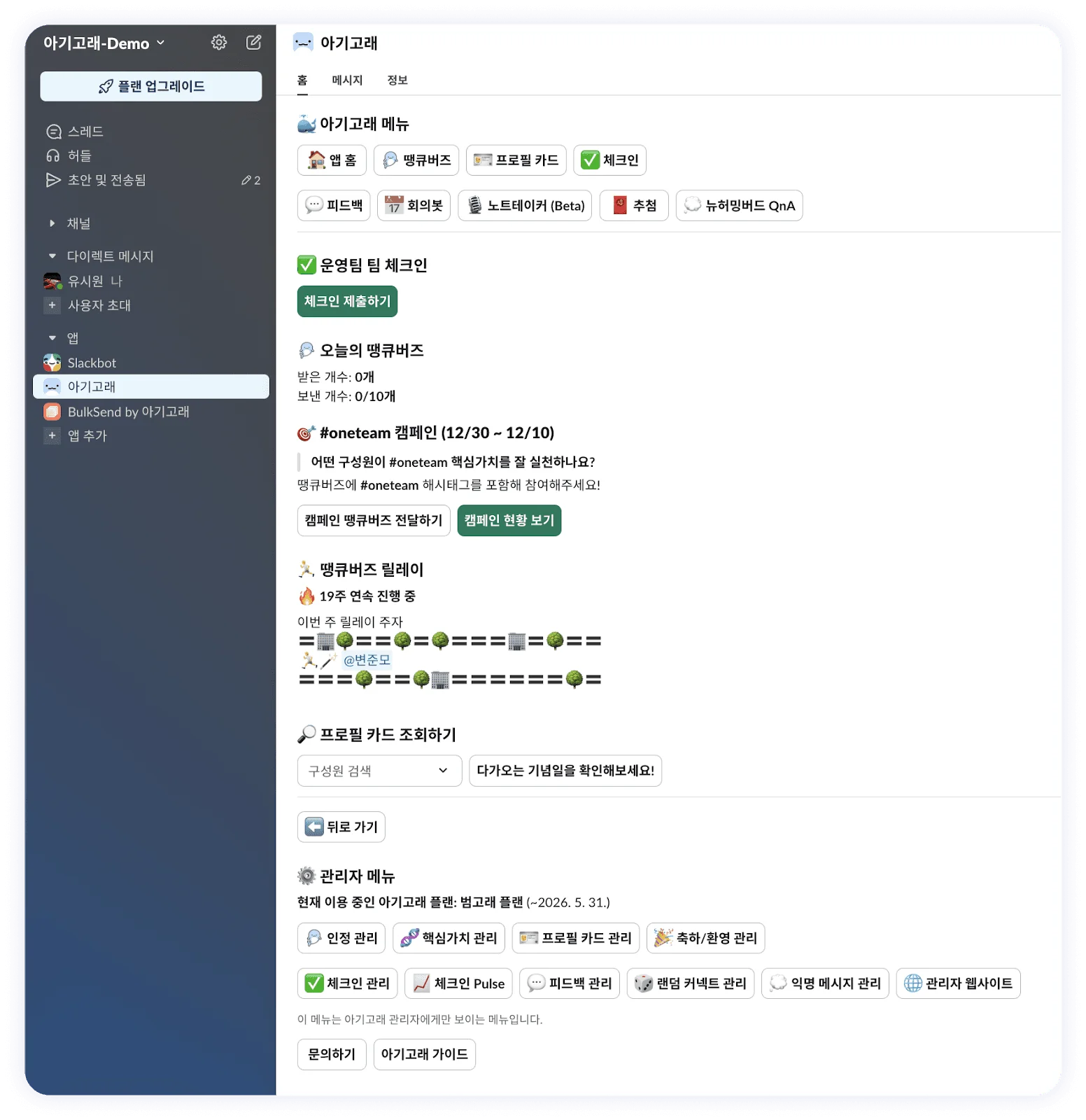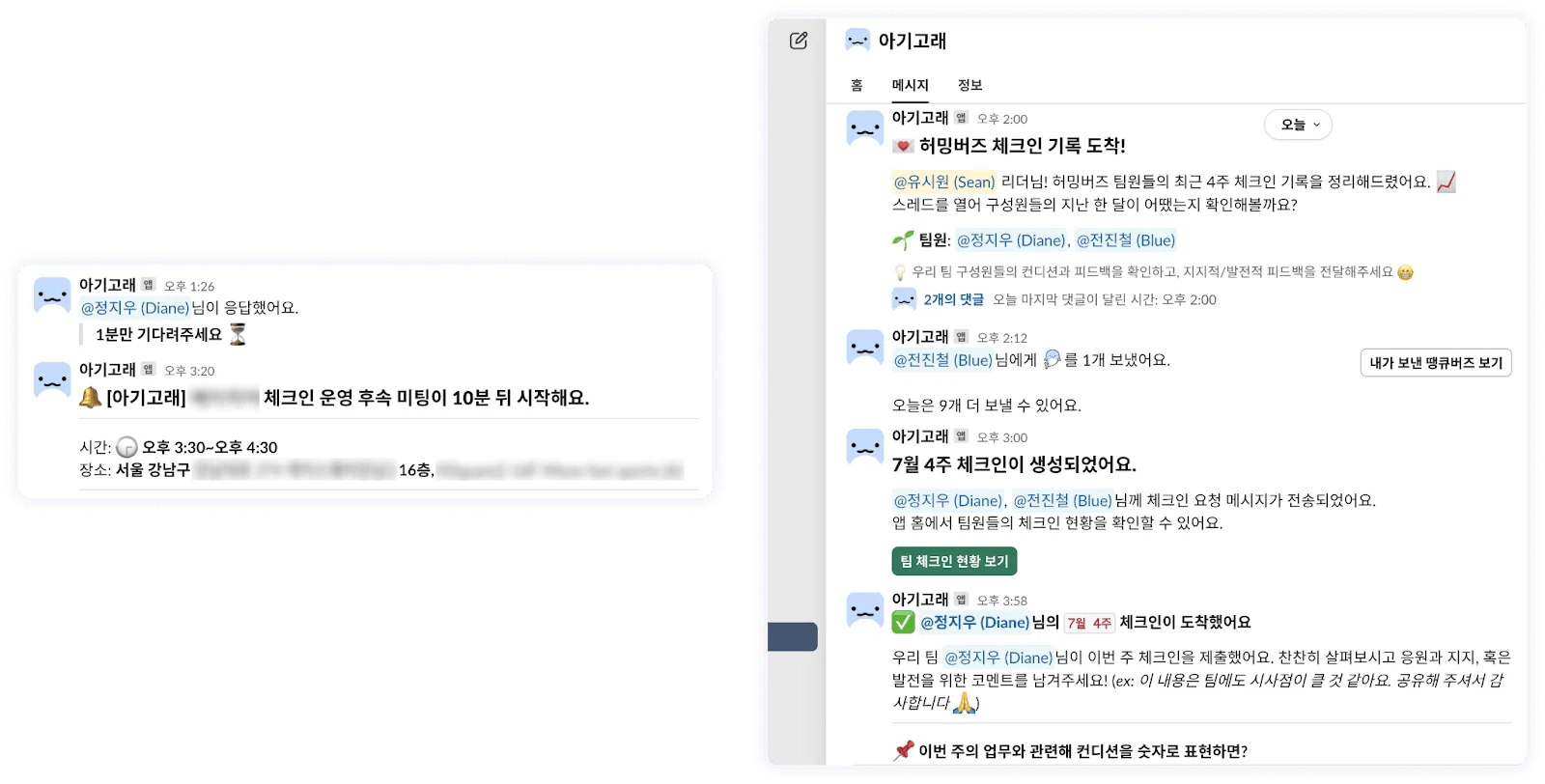 * 개발되어 있는 아기고래 Slack 앱을 설치해 회의봇, 위클리 체크인 용도로 활용 중인 모습