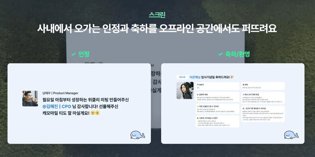 아기고래의 익명 칭찬 기능을 통해 서로에게 마음을 표현하기 어려운 팀원들도 부담 없이 진심을 나눌 수 있습니다.