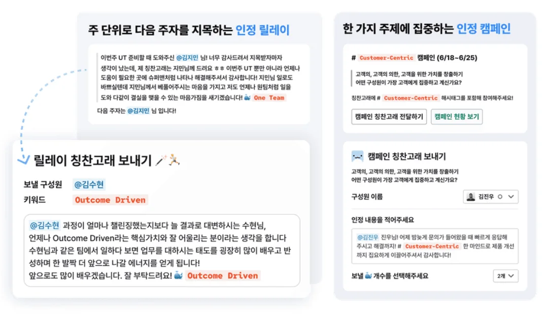 구성원들이 “어? 이거 재미있는데?” 처럼 느끼며 부담 없이 시작할 수 있어요. 그러다 보면 칭찬, 인정 문화가 점차 일상에 녹아들어요.